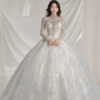 The elegant long sleeves are made from delicate tulle, offering a romantic sheer look while still providing coverage and structure. The voluminous ball gown silhouette adds drama and grace, perfect for a classic church ceremony or lavish ballroom reception. Whether you’re walking down the aisle or dancing under the stars, Zeryn moves beautifully and photographs like a dream.